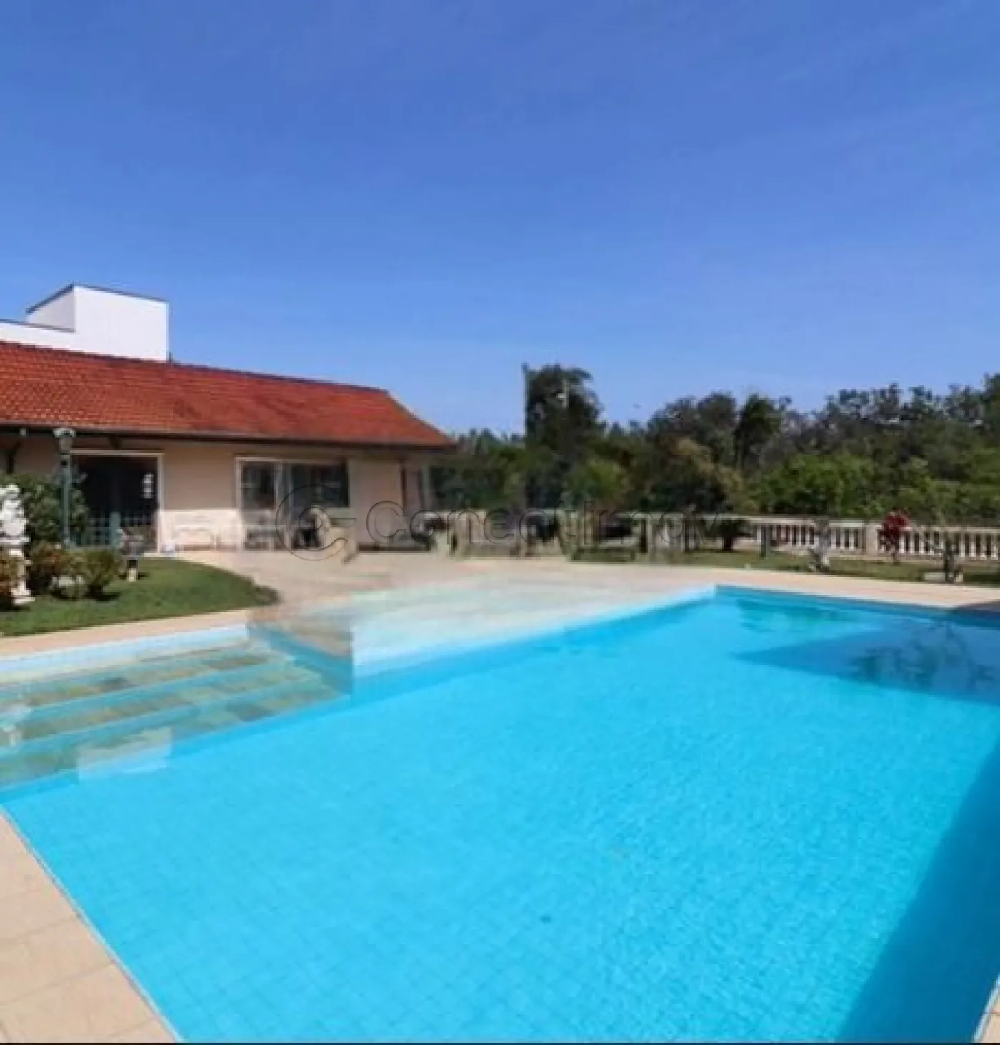 Quintal com piscina com sistema de aquecimento completo e varanda gourmet com churrasqueira.