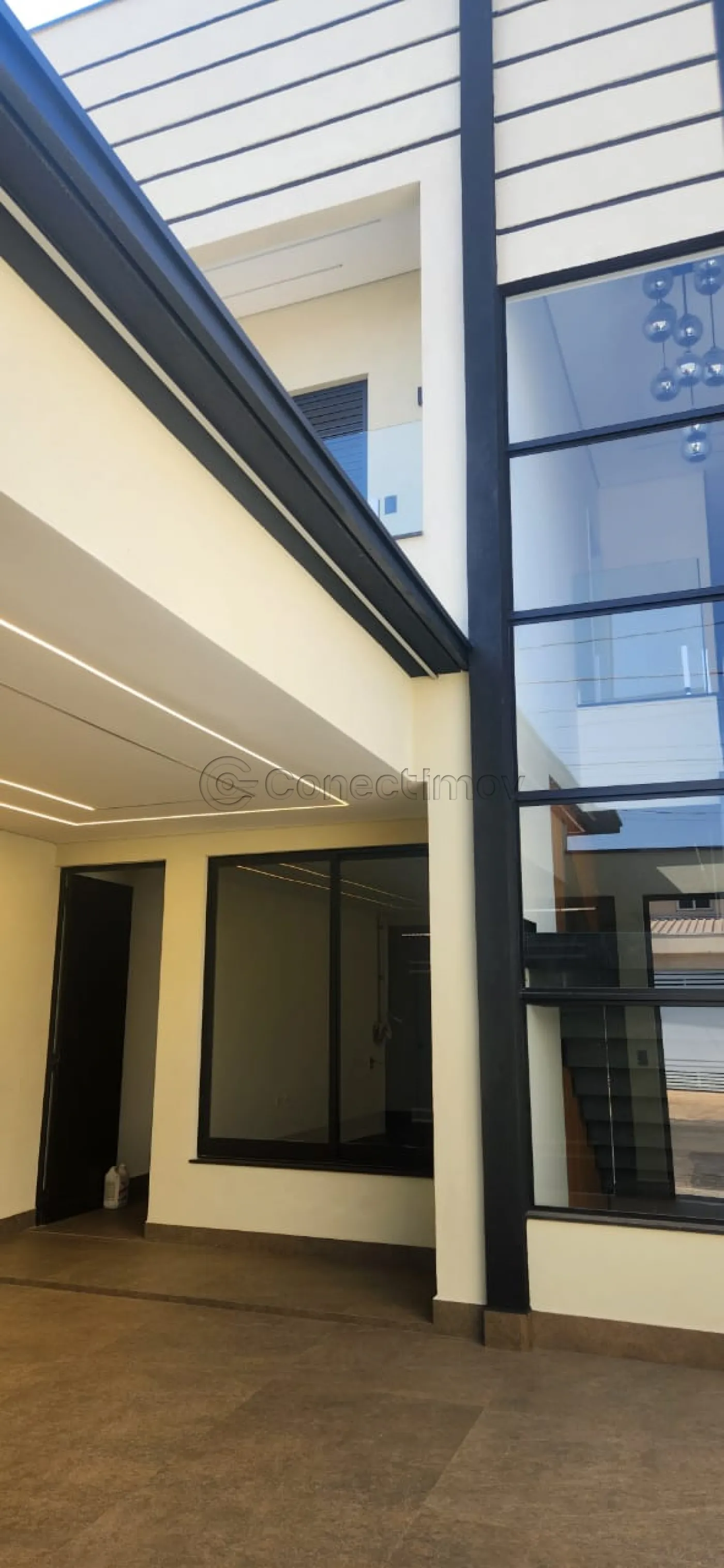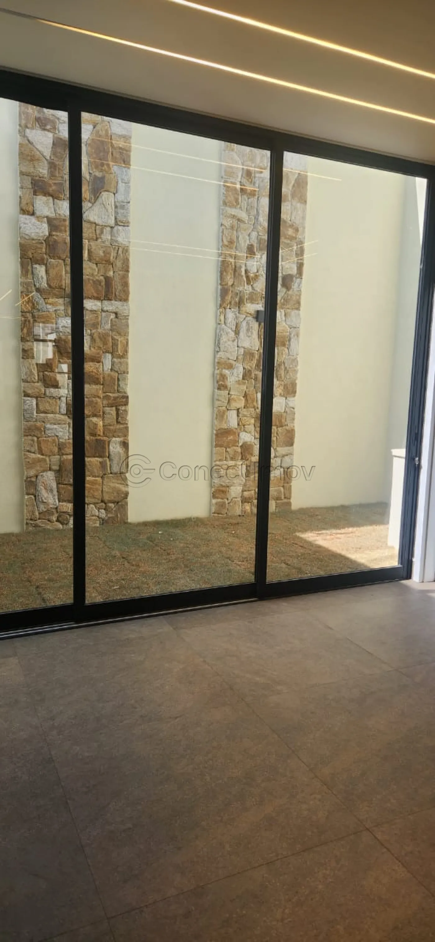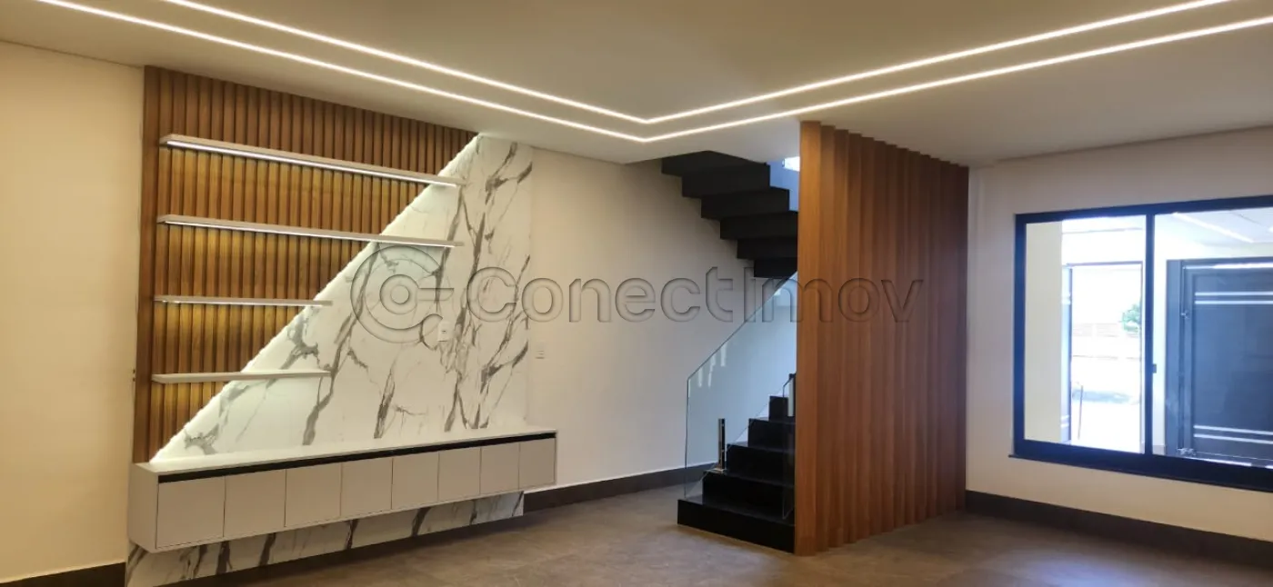 - Sala de estar com pé direito duplo, painel planejado e faixada em blindex