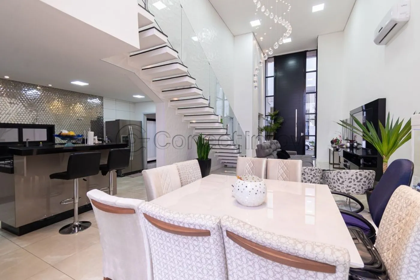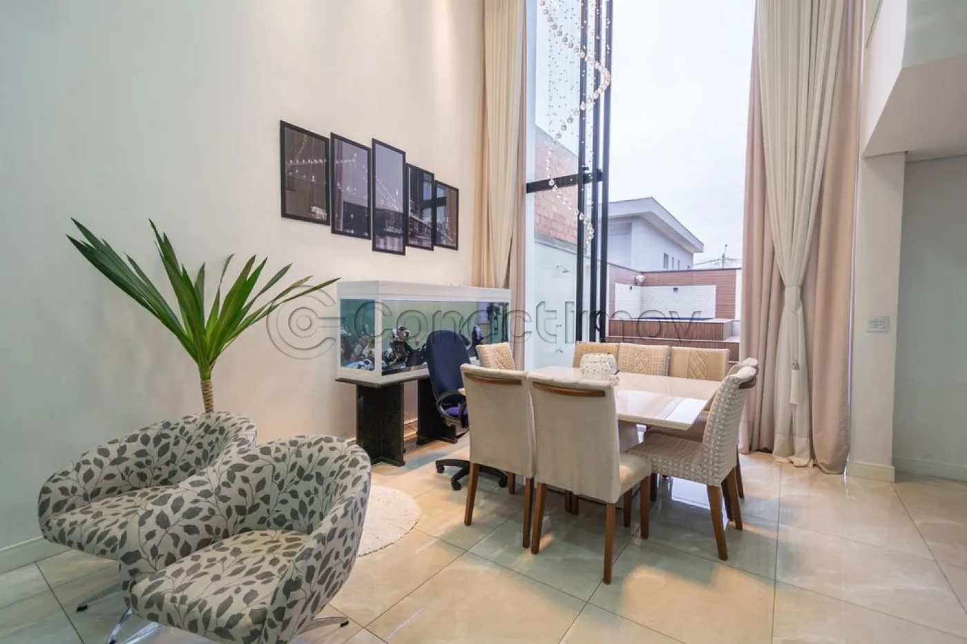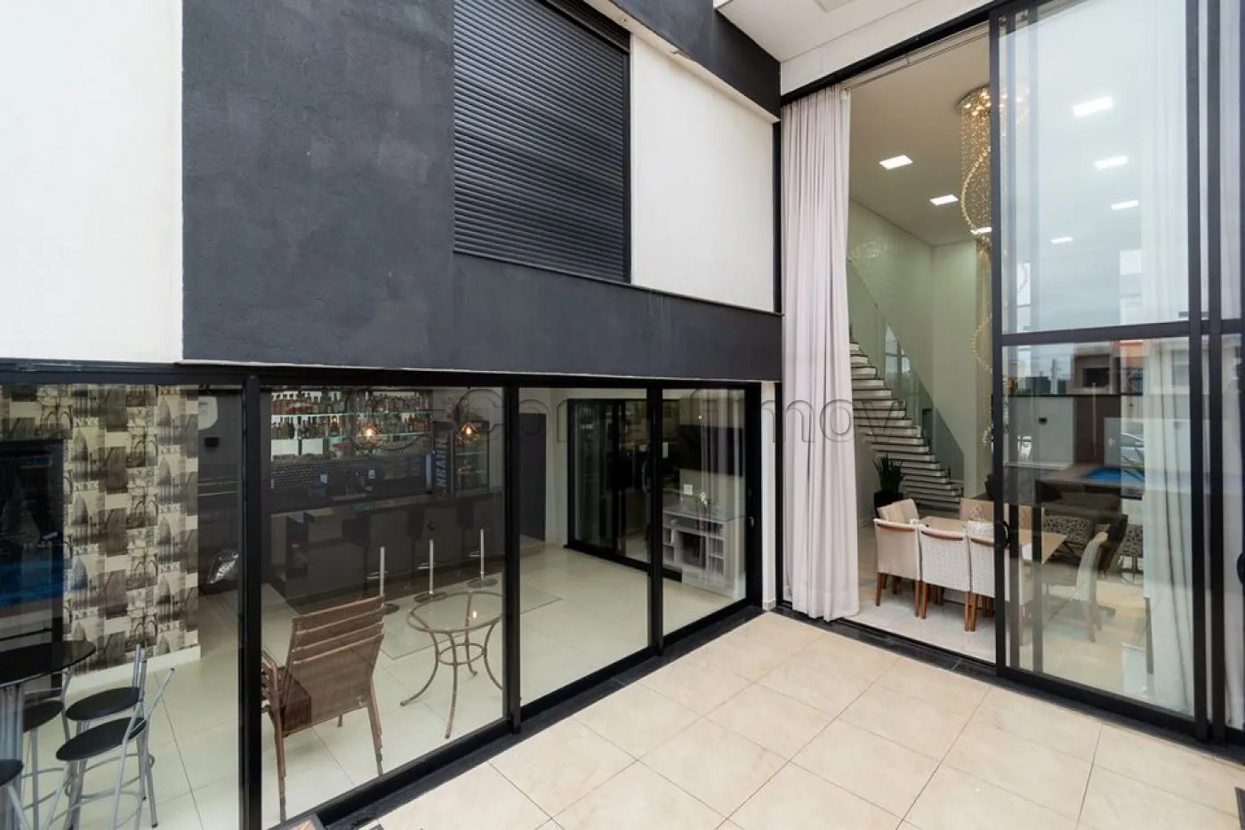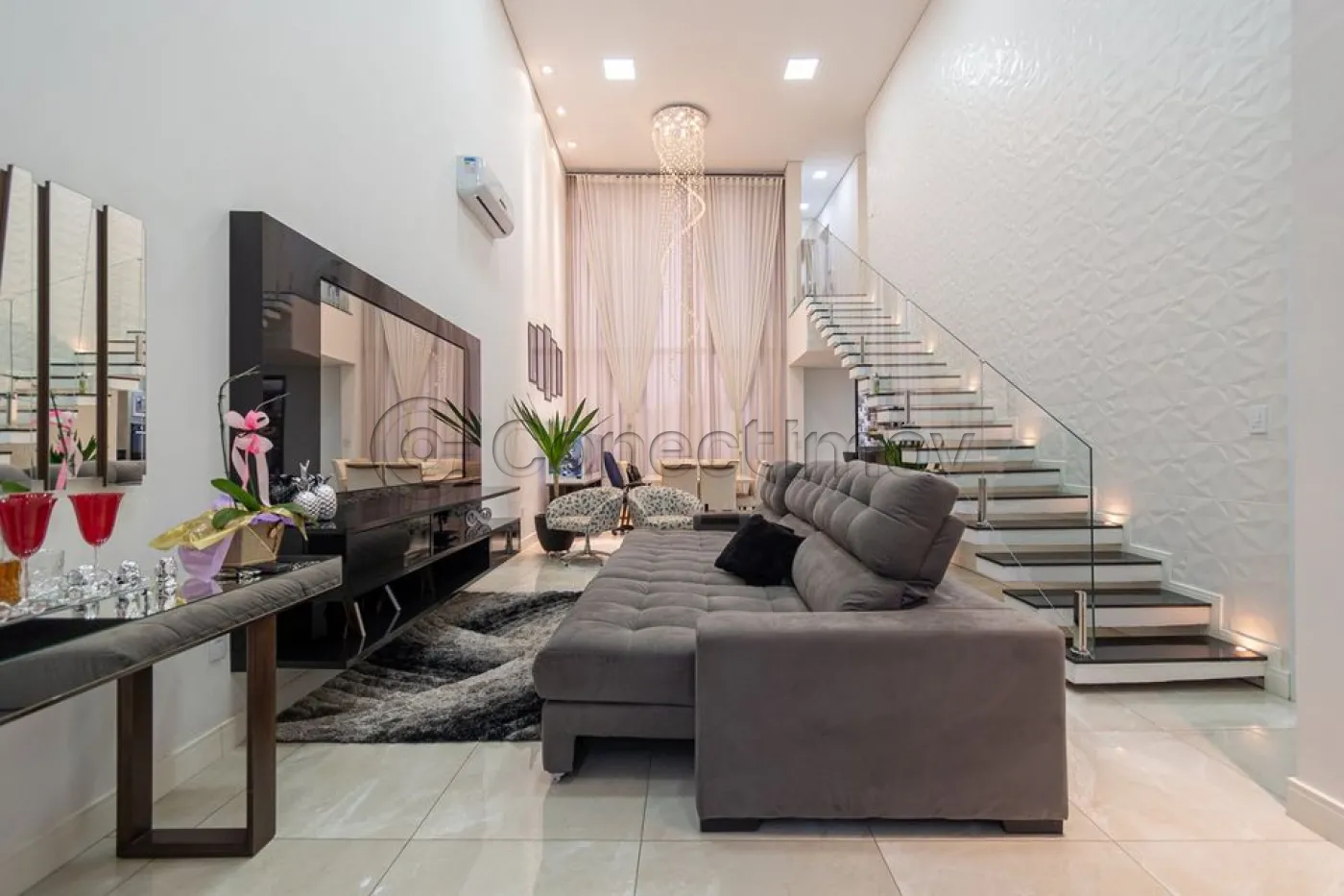 Sobrado localizado em condomínio de Hortolândia/SP! O imóvel oferece porta da entrada principal de modelo pivotante, com 6m de altura e inteiriça e a sala de estar é integrada com a sala de jantar com pé direito duplo, e tem um lustre de cristal com 4,5m². A cozinha é decorada com pastilhas laminadas, com armários de alta qualidade, uma ilha com o cooktop e armários e uma despensa. As três suítes têm os banheiros com cromoterapia, ar condicionado e janelas automáticas. Área gourmet equipada com chopeira e decorada com luz de Led, dois banheiros e uma hidromassagem com energia solar. 6 banheiros no total + 1 lavabo.