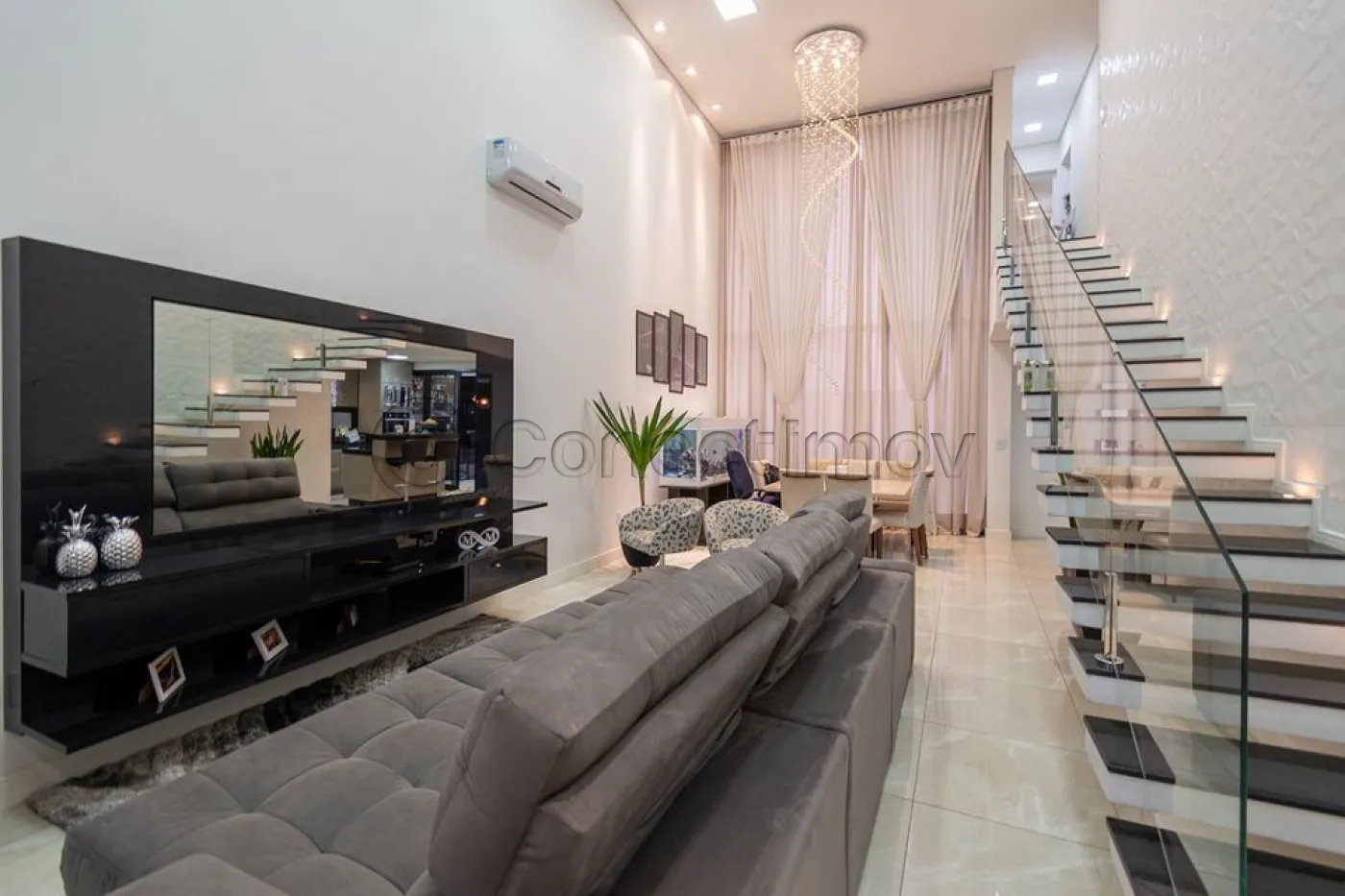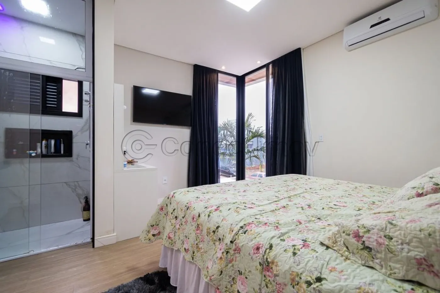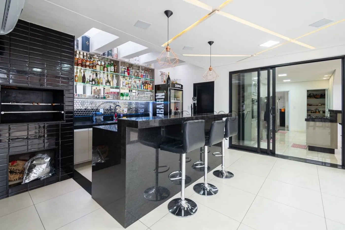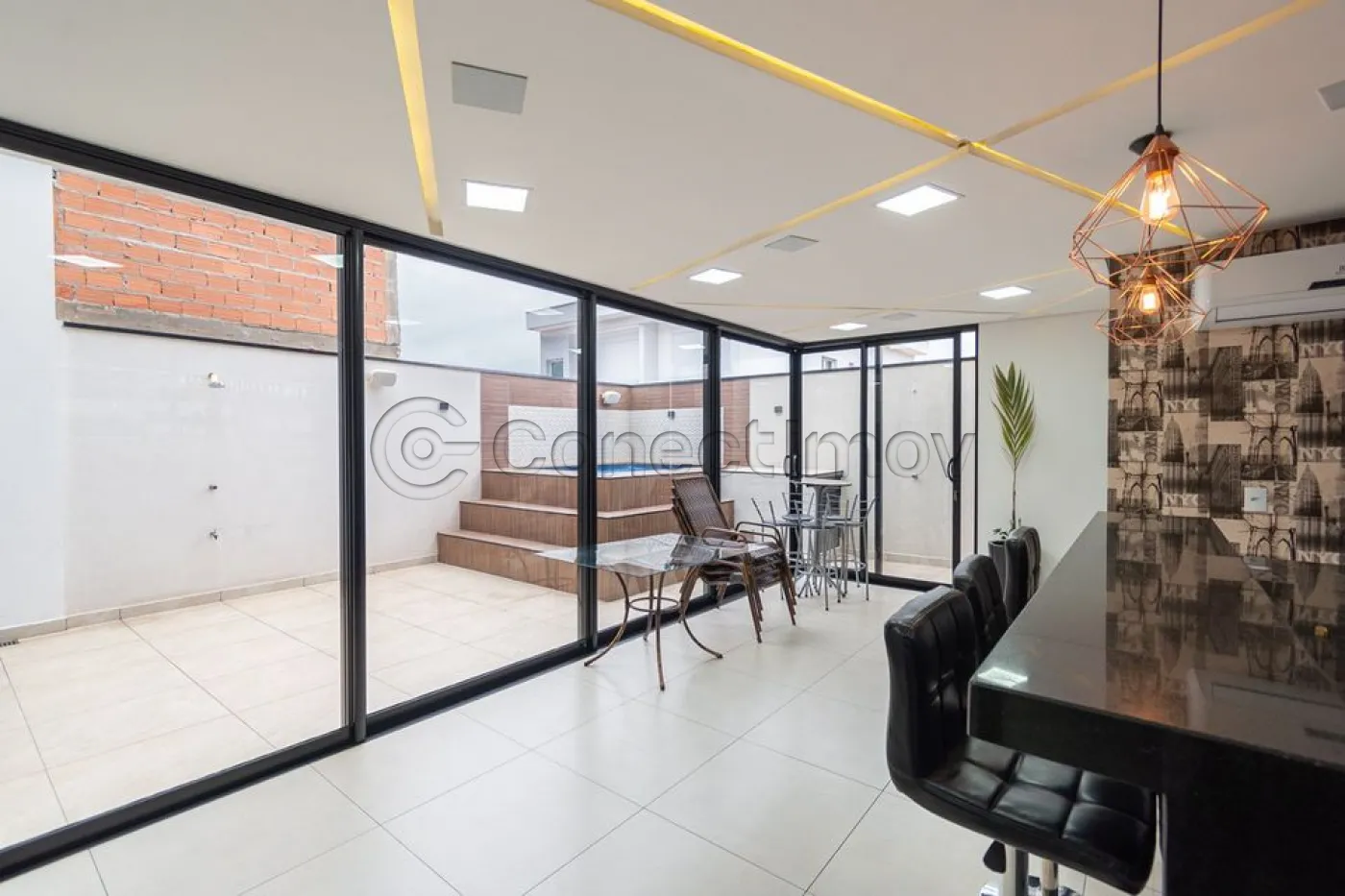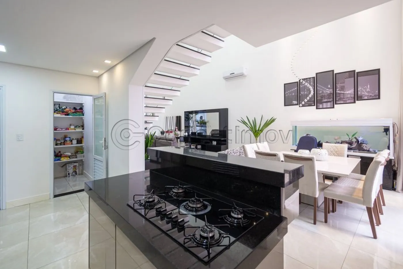 Sobrado localizado em condomínio de Hortolândia/SP! O imóvel oferece porta da entrada principal de modelo pivotante, com 6m de altura e inteiriça e a sala de estar é integrada com a sala de jantar com pé direito duplo, e tem um lustre de cristal com 4,5m². A cozinha é decorada com pastilhas laminadas, com armários de alta qualidade, uma ilha com o cooktop e armários e uma despensa. As três suítes têm os banheiros com cromoterapia, ar condicionado e janelas automáticas. Área gourmet equipada com chopeira e decorada com luz de Led, dois banheiros e uma hidromassagem com energia solar. 6 banheiros no total + 1 lavabo.